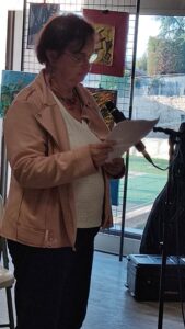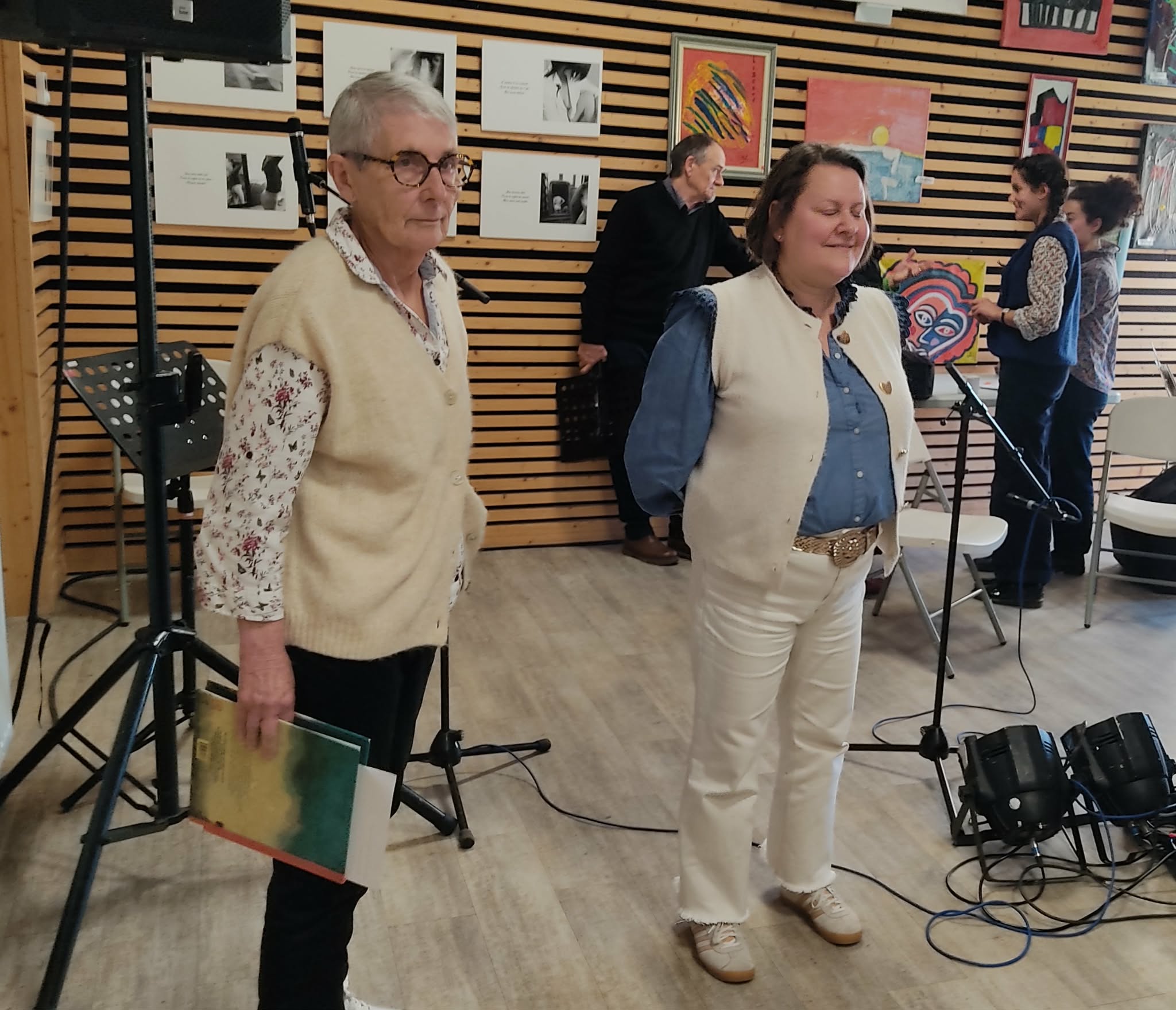 Nous, nous avons présenté chacune une chanson chantée : Edith, ou une lecture feministe : Fabienne, ou un texte de chanson : Maryvonne et encore un conte magnifique : Laurence « l’oiseau liberté »